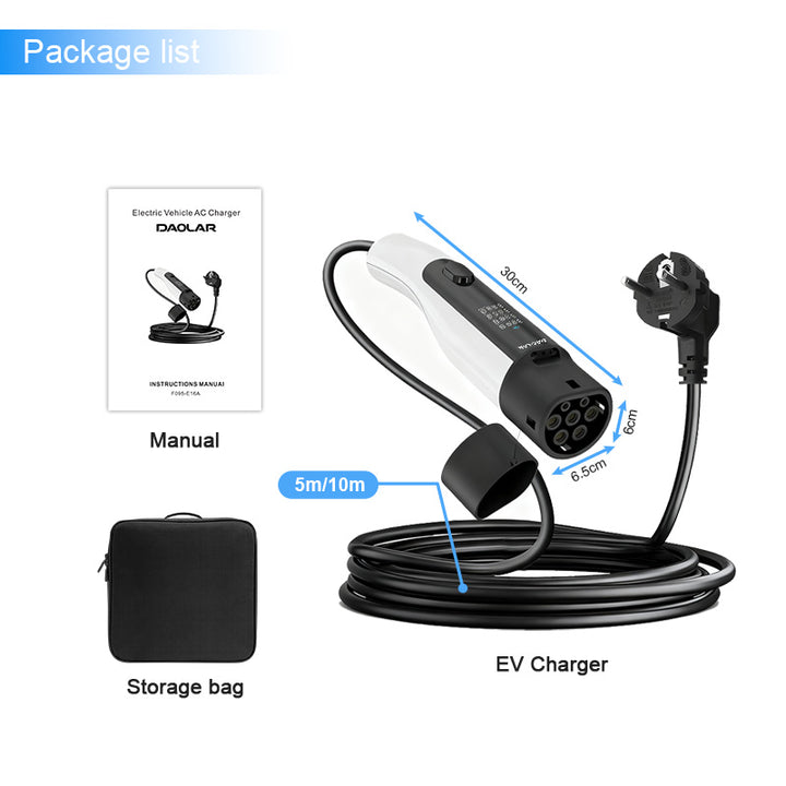 - ¡Di adiós al volumen! Hemos revolucionado el diseño eliminando la pesada caja de control. El conector Tipo 2 pesa solo 0.6kg, y el **cable de carga** de 5 metros pesa en total solo 1.8kg. Guárdalo fácilmente en tu maletero o mochila – ¡realmente un **cargador de VE del tamaño de un bolsillo**!