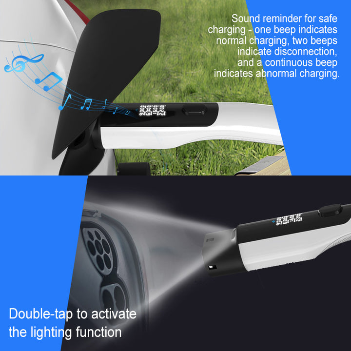- Iluminación nocturna, sin más tropiezos: Haz doble clic para activar la luz de la pistola Tipo 2, facilitando encontrar tu puerto de carga incluso en la oscuridad.
