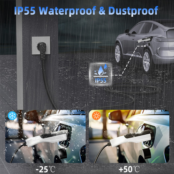 - Resistente al agua y polvo IP55: Construido con una carcasa duradera, nuestro **cargador móvil para VE con certificación IP55** soporta diversas condiciones climáticas europeas. Funciona perfectamente de -25℃ a 50℃, confiable en cualquier clima.