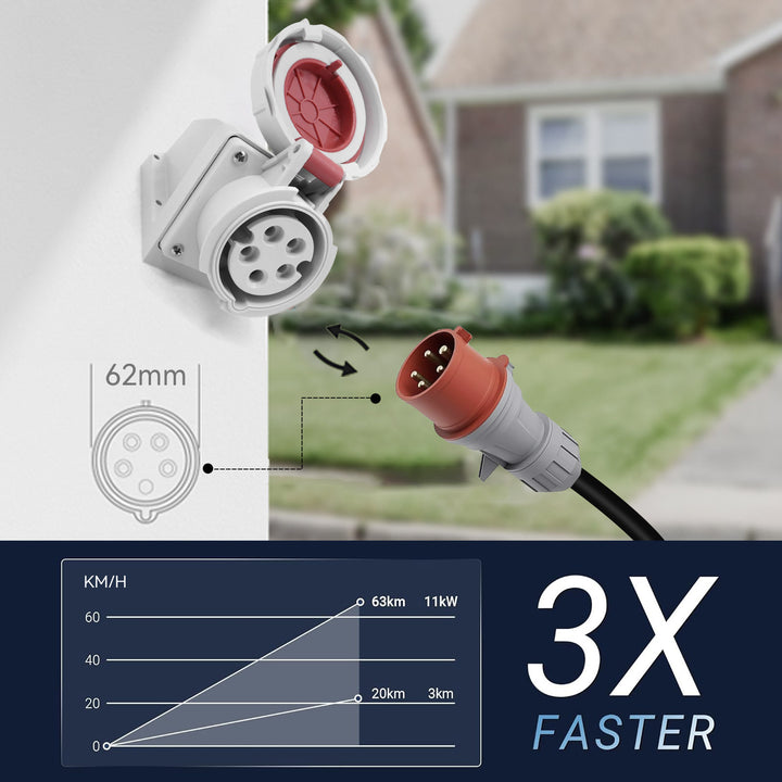 - ✓ Potente carga trifásica de 11 kW: Experimente velocidades de carga de hasta 5 veces más rápido que un enchufe doméstico estándar (Schuko). Añade aproximadamente 60-70 km de autonomía por hora de carga, lo que reduce significativamente el tiempo de inactividad. Perfecto para cargar durante la noche o para una recarga rápida.