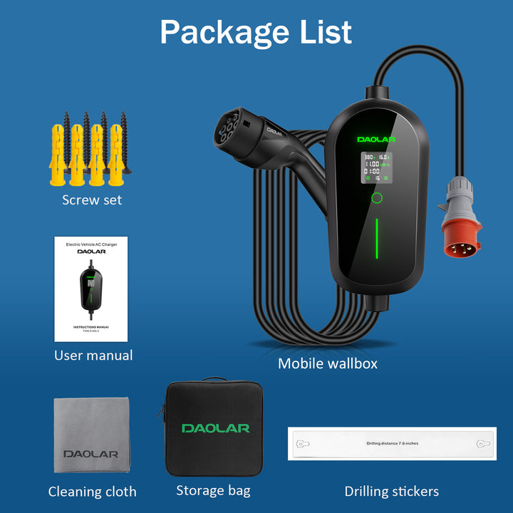Daolar Mobile Wallbox 11KW, cable de carga trifásico tipo 2 con enchufe CEE, temporizador de 12 h y estaciones de carga EV con corriente ajustable de 6 a 16 A