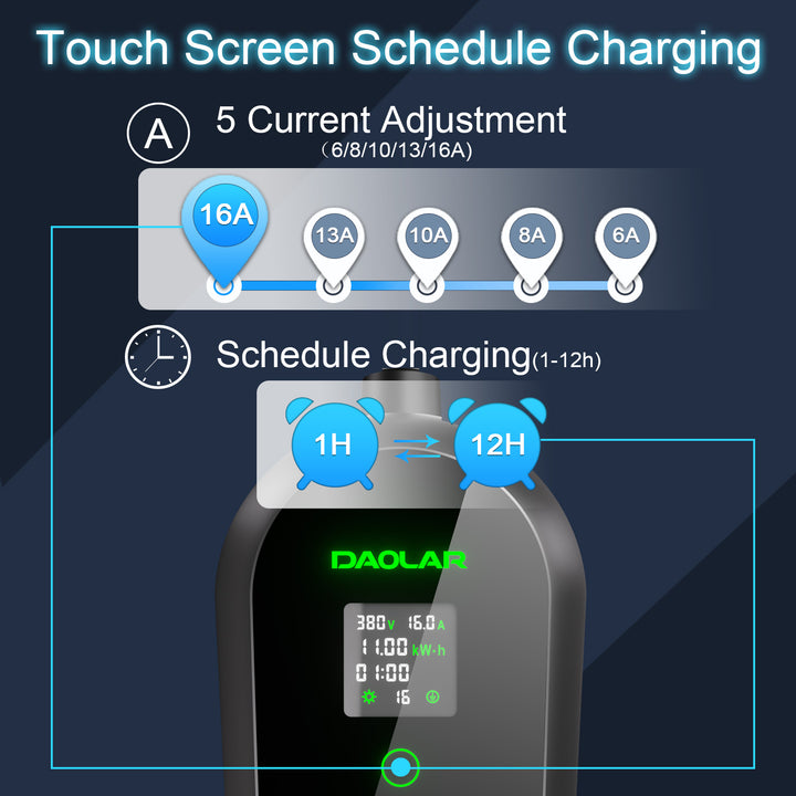 - Corriente ajustable (6A/10A/13A/16A): Ajuste fácilmente la potencia de carga para que coincida con la capacidad del circuito de su hogar o para cargar suavemente su batería.