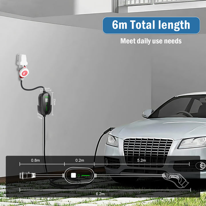 - ✓ Simplicidad Plug & Play: No necesita un electricista costoso ni una instalación compleja. Simplemente conecte el enchufe rojo CEE de 16 A a la toma industrial correspondiente, conecte el cable Tipo 2 a su vehículo y la carga comenzará automáticamente.
