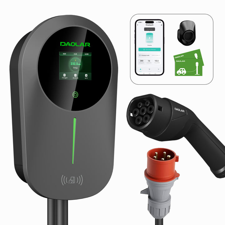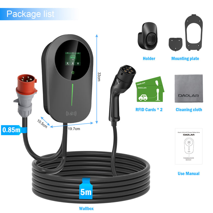 Estación de carga para vehículos eléctricos Daolar Wallbox de 11 kW con aplicación trifásica de 6-16 A, tipo 2, con pantalla digital controlable y 2 tarjetas RFID para vehículos eléctricos, protección de corriente RCD B mejorada