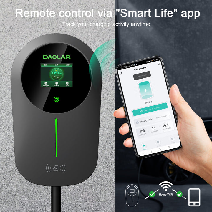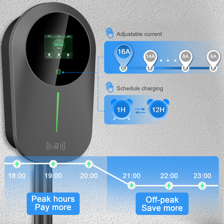 El cargador Wallbox admite carga programada de 0 a 24 horas, lo que te permite configurar horarios de carga para que se inicien automáticamente durante las horas valle de la noche, reduciendo así el coste de la electricidad. Con el control remoto de la app Smart Life, puedes gestionar fácilmente cada sesión de carga, lo que hace que la conducción ecológica sea más económica y eficiente.