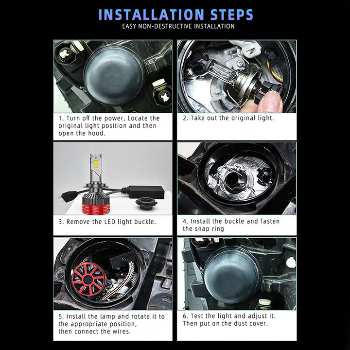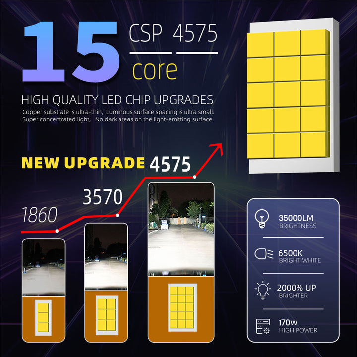 BRILLO EXTREMO CON 15 NÚCLEOS CSP 4575: Diseñado con la última tecnología de LED de 15 núcleos CSP 4575, este kit de faros ofrece un impresionante brillo de 35,000 lúmenes y 170W de potencia por juego. Con una temperatura de color blanco frío de 6500K, estas bombillas son un 2000% más brillantes que los halógenos estándar, proporcionando un rango de iluminación más amplio y lejano para eliminar las zonas oscuras en la carretera.