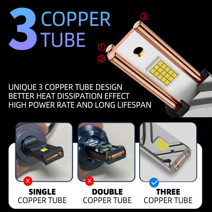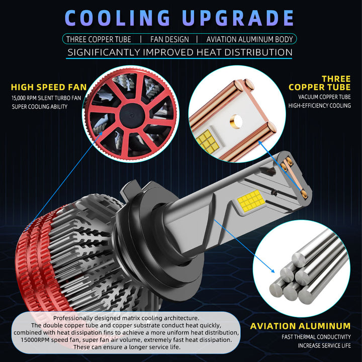 SISTEMA REVOLUCIONARIO DE ENFRIAMIENTO CON 3 TUBOS DE COBRE: A diferencia de las bombillas estándar que usan tubos de calor simples o dobles, este modelo cuenta con un diseño exclusivo de 3 tubos de cobre para una conductividad térmica superior. Combinado con un cuerpo de aluminio aeronáutico y un ventilador turbo silencioso de 15,000 RPM, la arquitectura de enfriamiento en matriz previene eficazmente el sobrecalentamiento, asegurando una salida de alta potencia estable y una vida útil significativamente más larga.